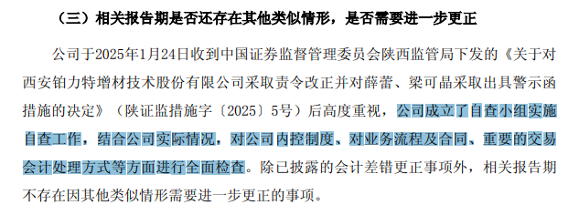 不过,在1月份收到陕西证监局下发的警示函后,公司成立了自查小组实施自查工作,结合公司实际情况,对公司内控制度、业务流程及合同、重要的交易会计处理方式等方面进行全面检查。