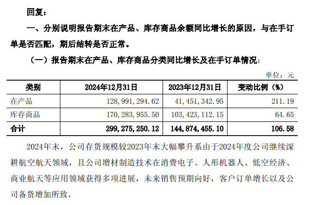 具体来看,2024年末,铂力特“在产品”和“库存商品”的存货余额分别约1.29亿元和1.70亿元,同比增长211.19%和64.65%。对此,问询函要求公司说明2024年末在产品、库存商品余额同比增长的原因,与在手订单是否匹配,期后结转是否正常。