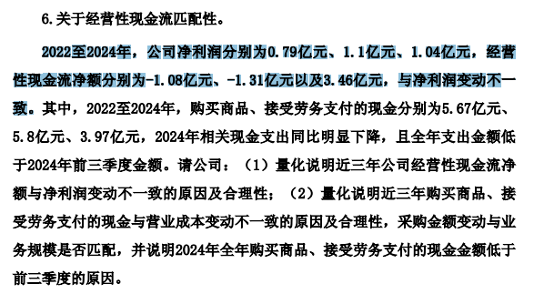 此外,监管还关注公司经营性现金流匹配性问题。数据显示,2022年至2024年,铂力特净利润分别为0.79亿元、1.10亿元、1.04亿元,经营性现金流净额分别为-1.08亿元、-1.31亿元以及3.46亿元,与净利润变动不一致。对此,问询函要求公司量化说明前述变动不一致的原因及合理性。