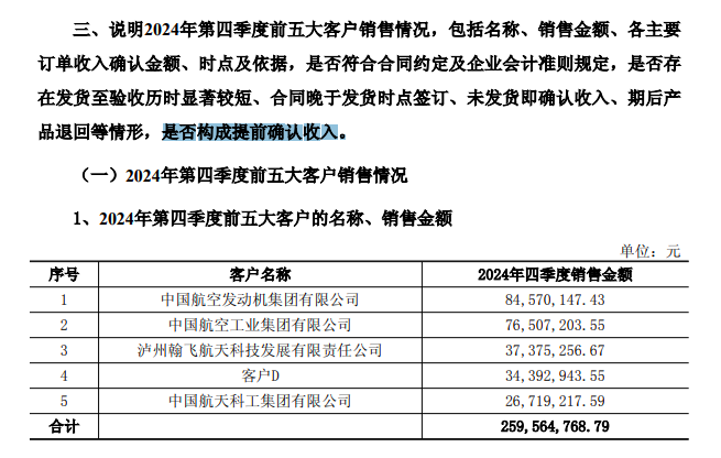 年报显示,2024年航空航天仍为铂力特营业收入的主要来源。分季度来看,第四季度营收占比达四成。问询函要求铂力特结合2024年第四季度前五大客户的销售情况,说明是否存在发货至验收历时显著较短、合同晚于发货时点签订、未发货即确认收入、期后产品退回等情形,是否构成提前确认收入。